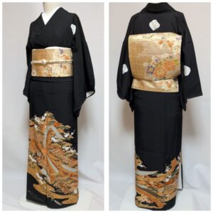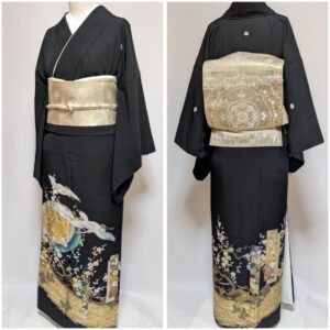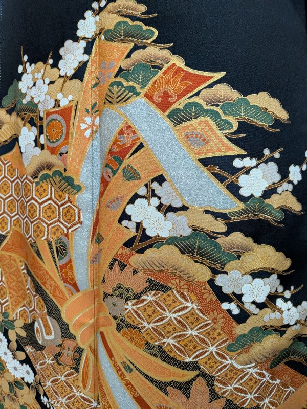 黒地に金銀の松竹梅や鶴が優雅に描かれた、格式高い黒留袖です。気品あふれる意匠が晴れの日をより華やかに彩る一着です。